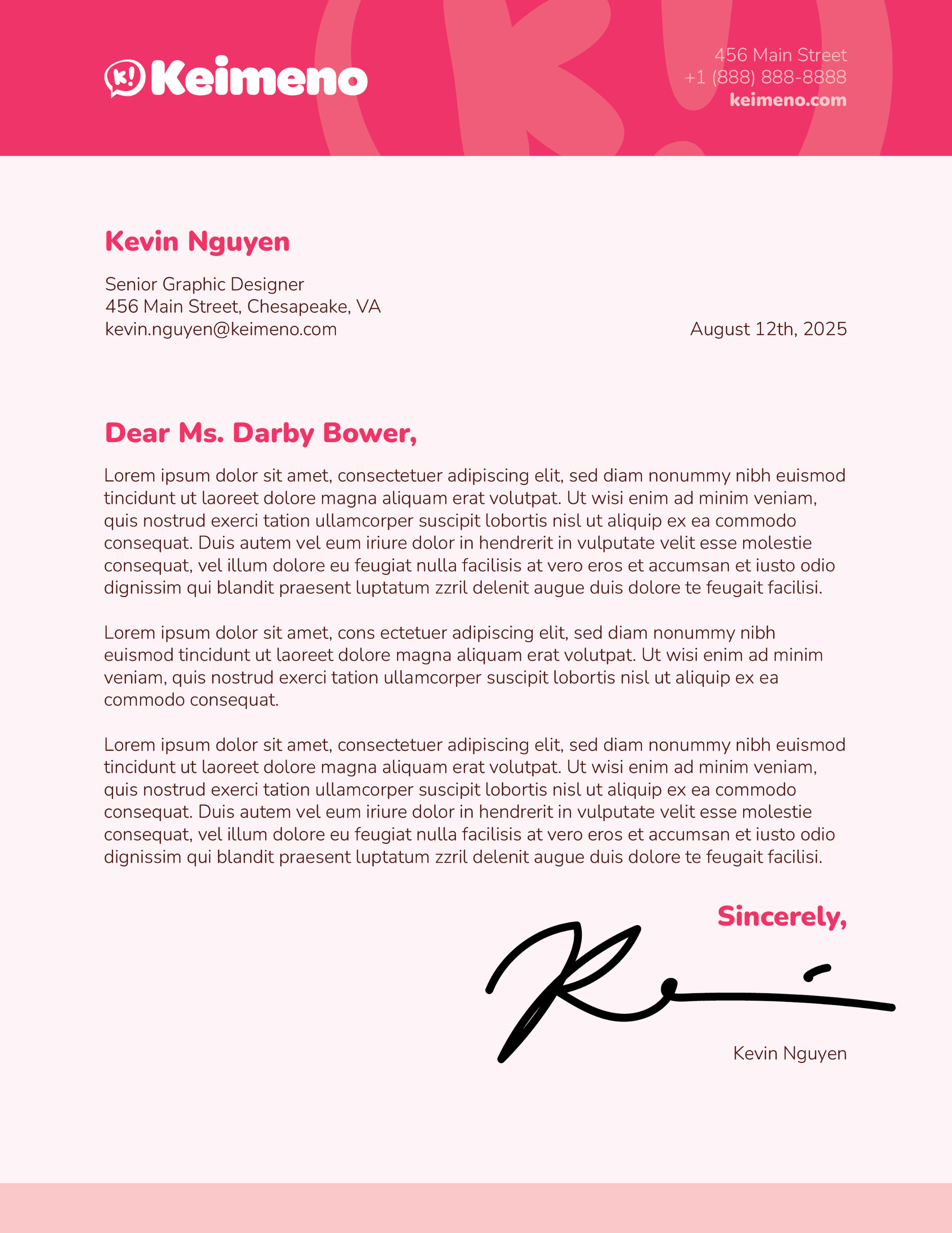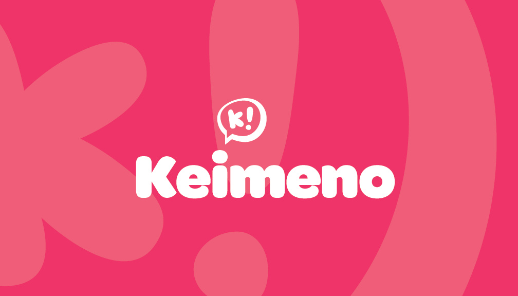 Logo, style guide, business card, letter, evelope, and mockups designed for Keimeno, a fictitious messaging and social media application targeted at the modern, younger generation.