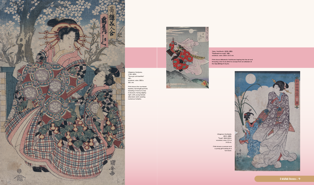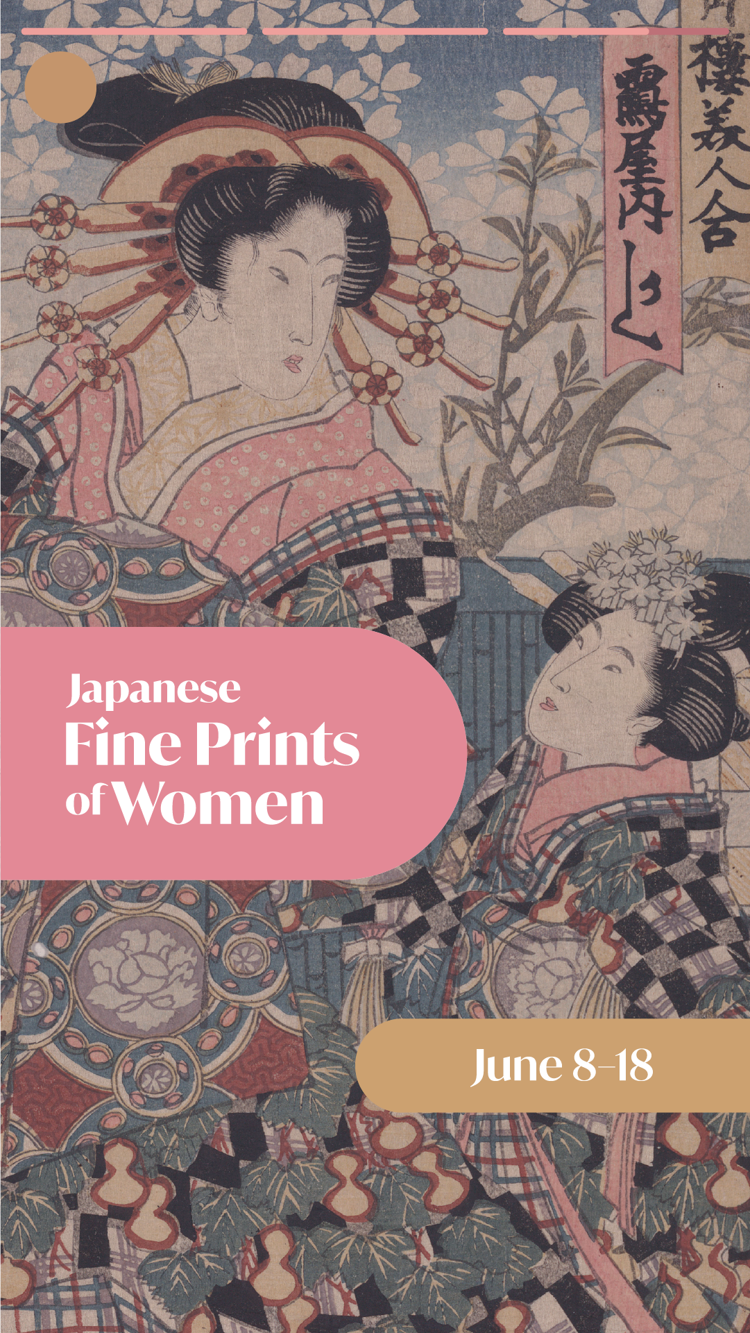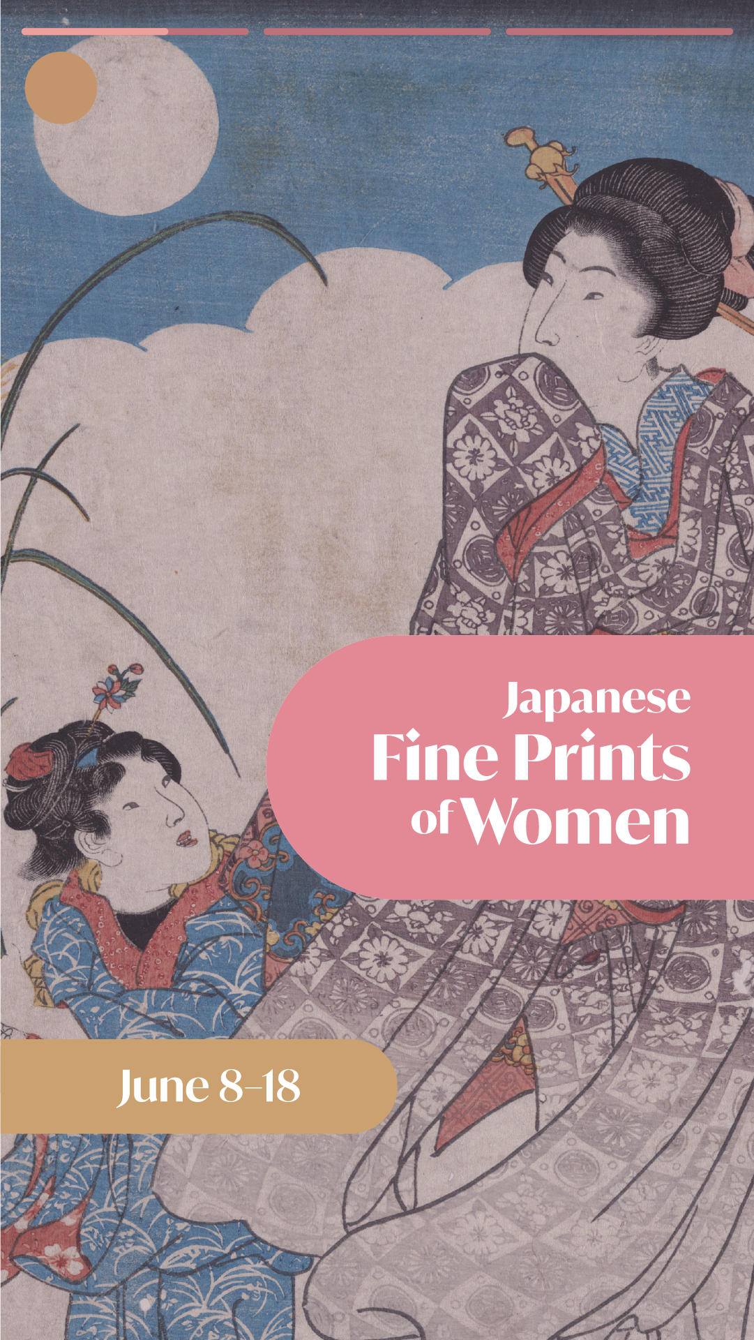 Booklet, postcard, and social media story collateral for a ficticious art exhibit displaying fine prints from Japan, pre-1900s.